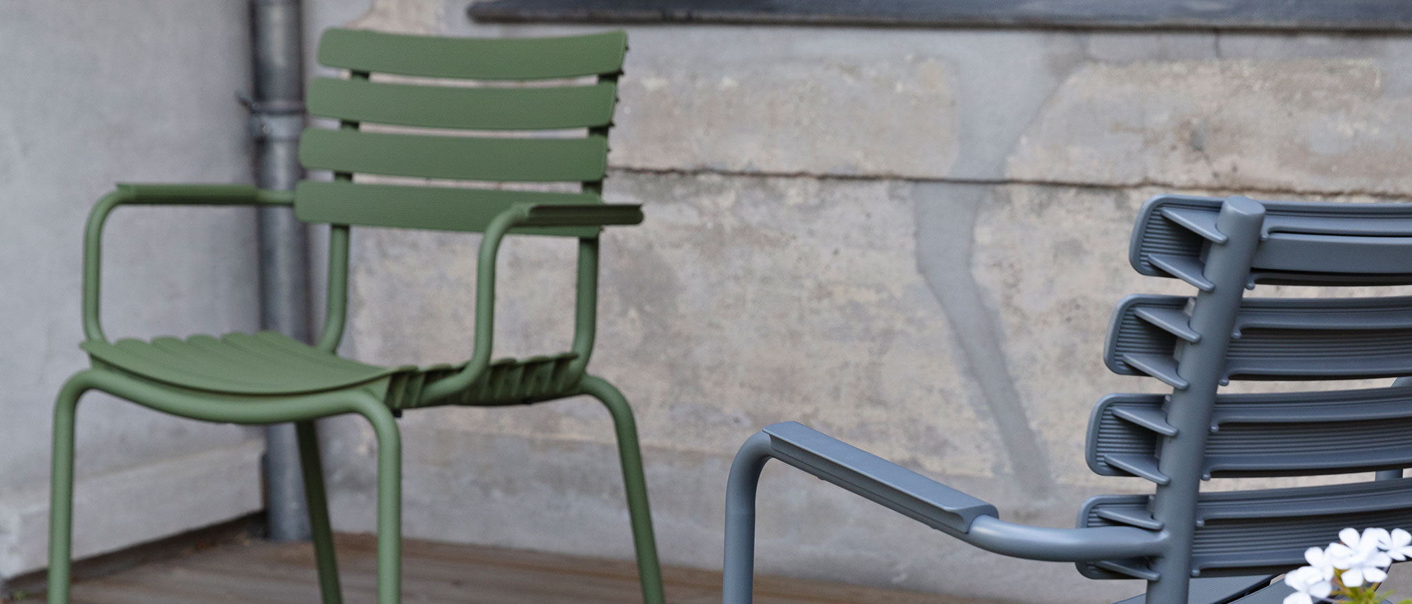 ReCLIPS is a line of outdoor dining chairs with wide lamellas clipped on a light powder coated aluminum frame. The lamellas are made from recycled Danish household composite and are produced in Denmark. This technology for furniture production is developed in Denmark. With ReCLIPS you are basically looking at the result of mixing Danish design and Danish innovation - and converting this new thinking and materials into a chair.