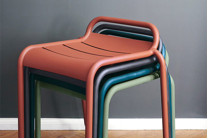 This stool from the iconic Luxembourg collection is practical, compact and hard-wearing, with its aluminium design and anti-UV, anti-corrosion powder coating. This occasional seat is also comfortable and good-looking. The Luxembourg Stool comes with a low backrest that also acts as a handle and can be moved around as you like. It can also be stacked to takes up very little space on the terrace when not in use.