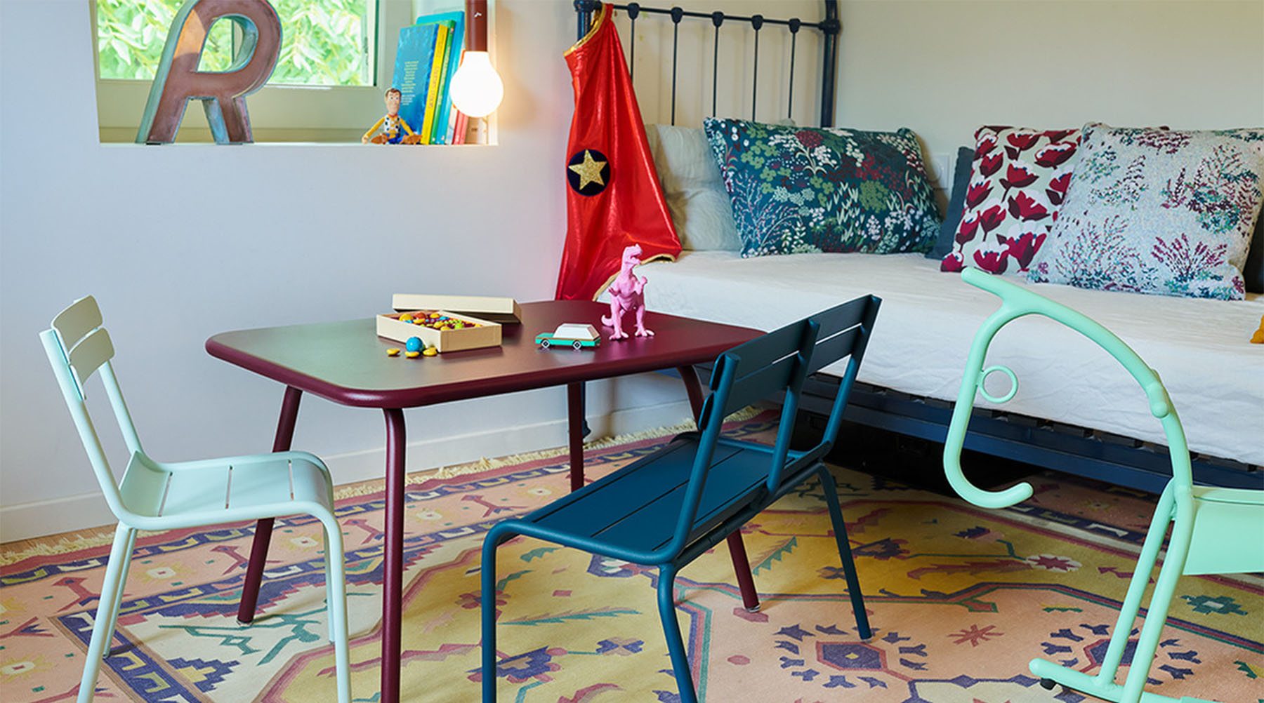 A table for three- to six-year-olds to match the miniature version of the Luxembourg chair. This petite but practical piece of furniture can be moved with ease from one corner of the house to the other, one moment serving as a desk in the bedroom, the next as a table for tea in the kitchen, and the next as the setting for an art workshop in the garden!