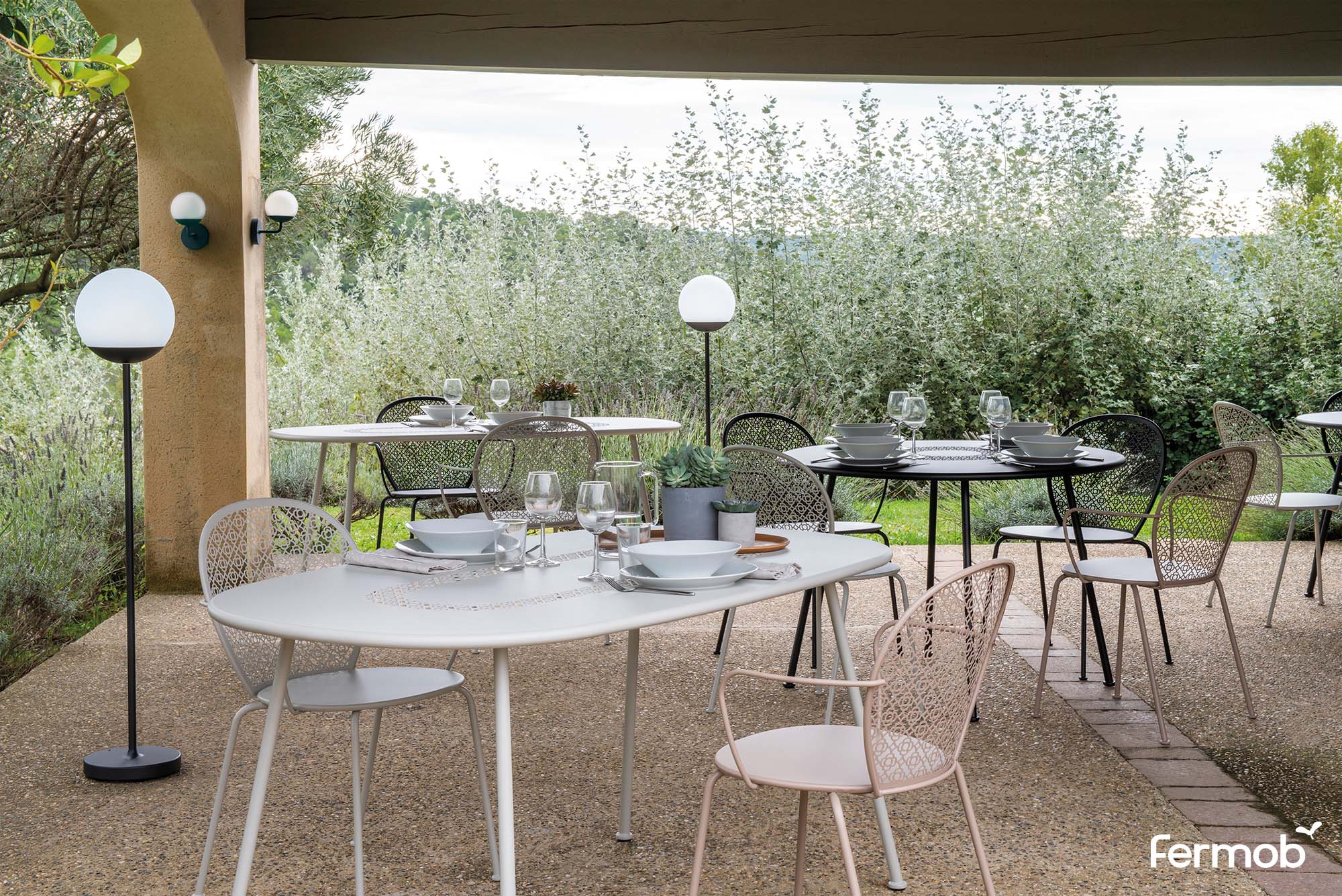 The Lorette collection is available in all the colours of the Fermob 2020 colour chart and will undoubtedly charm you! This collection, with a subtle monogram signature, is undoubtedly destined to become iconic. Imagine it in the countryside, on a terrace, in the shade of linden trees, or in a meadow. Accompanied by its fellows, it is the “seat” of whispered secrets, spirited conversations, uncontrolled laughter and long meals taken with friends.
