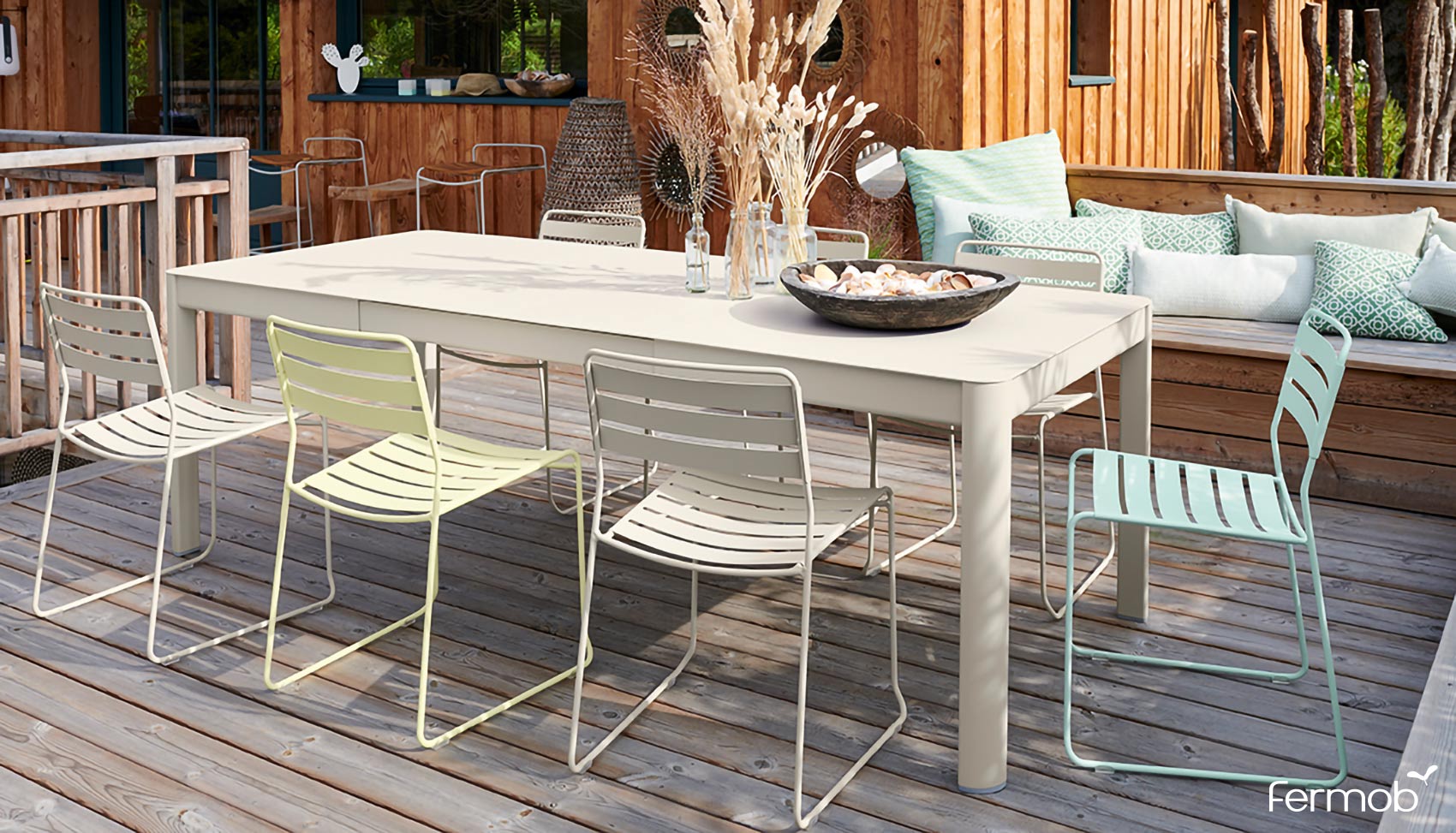 Ribambelle Dining Table with 2 Extensions is the most modular metal table on the market seating 6, 8, or 10 people. It can go from being 53in long to 92in long with its two 19in extensions that are very easy to use. Its crosspieces with slide and bearing construction make it rock solid, whatever the configuration. This 100% aluminium garden table is very stable and stands up well to outdoor conditions. Housed in a storage compartment hidden under the table, its extensions are discreet, so it always looks great any way you use it.