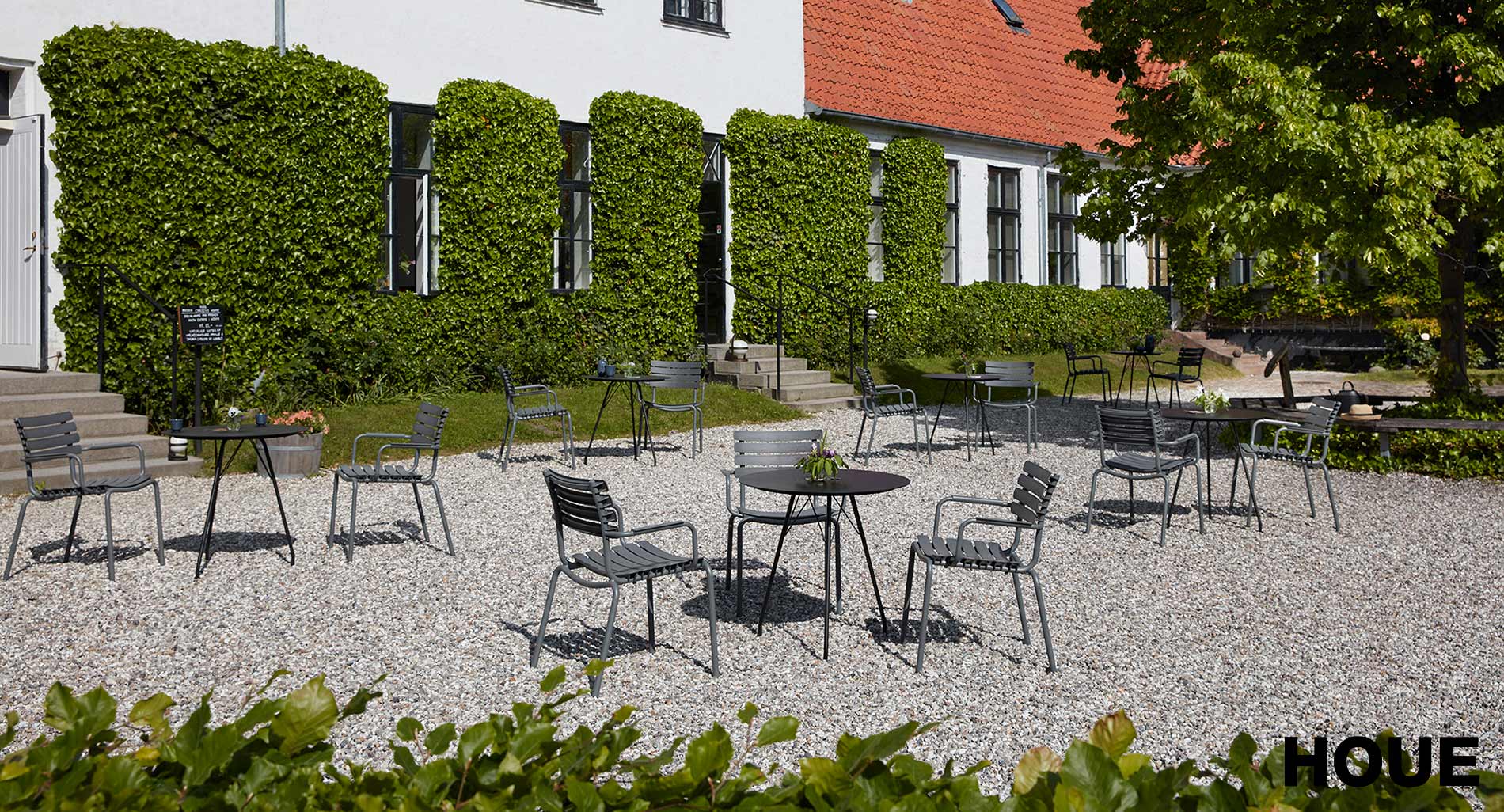 The HOUE Circum Café table makes a perfect setting together with many of our favorite dining chairs on a smaller terrace or balcony – or at the café!