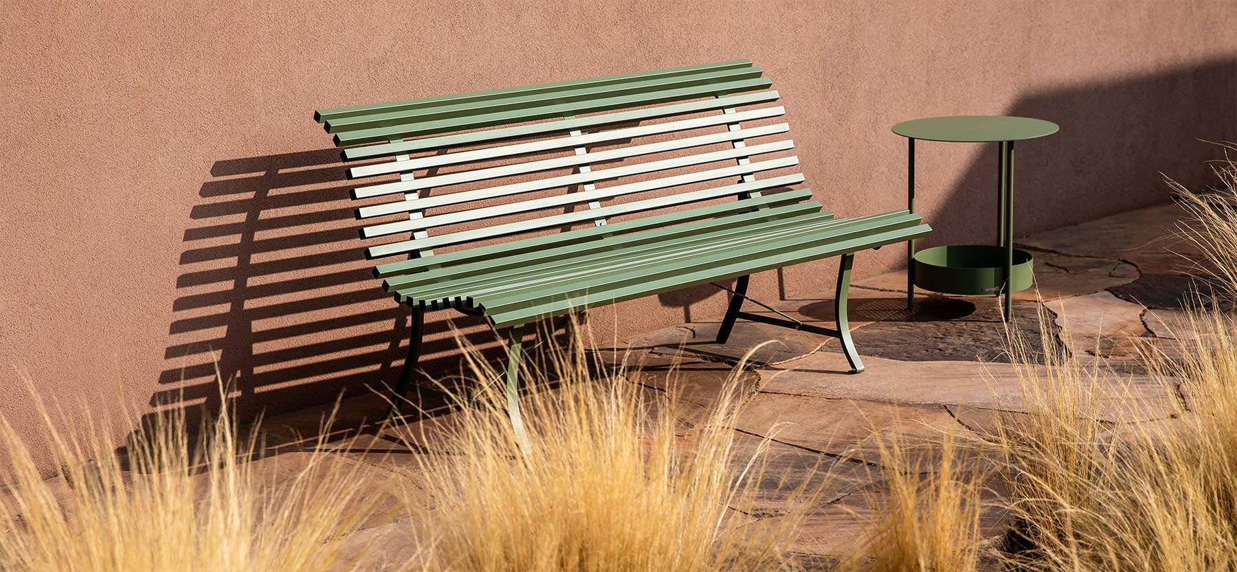 The quality steel construction and timeless shape define the Louisiane 59" Bench from Fermob. Finely crafted using sturdy steel slats, the design of this bench is reminiscent of classic wooden park benches and perfect in any outdoor setting.